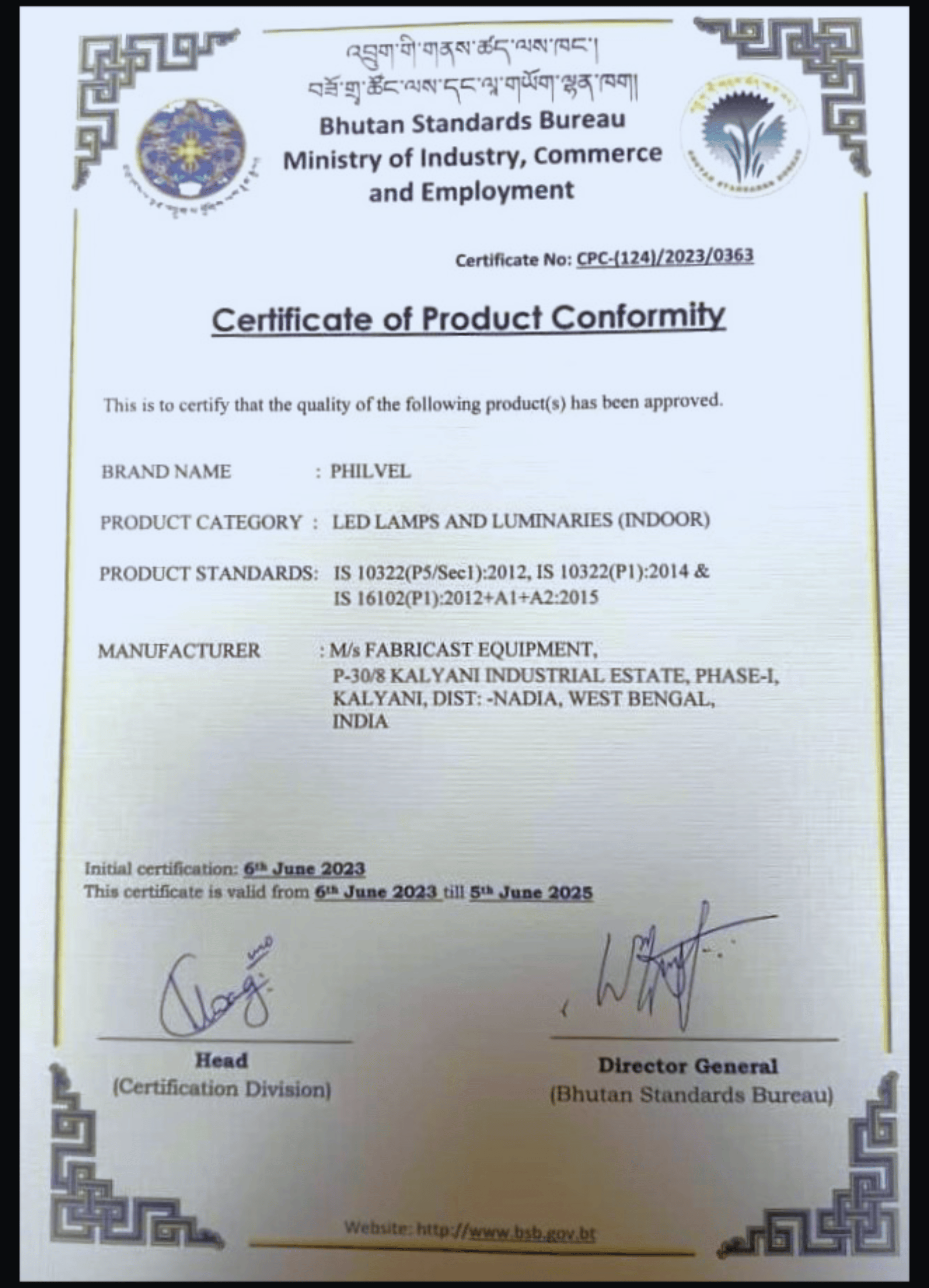 Bhutan Standards Bureau Certificate